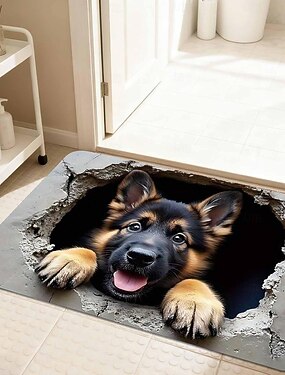 Felpudo con impresión plana 2D de ilusión óptica 3D de cachorro de pastor alemán, diseño que rompe una grieta para divertirse. &entrada acogedora a casa