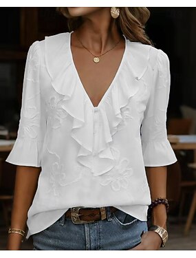 Mujer Blusa Encaje Volante Color sólido Elegante Básico Casual Manga Corta Escote en Pico Tops regulares Diario Azul Piscina Negro Blanco Vino Rojo Verano Primavera