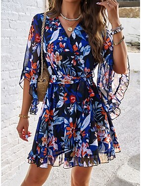 Mujer Mini vestido Vestido informal Vestido de flores Vestido de verano Vestido lencero Moda Moderno Diario Playa Fin de semana Ajuste regular Floral Manga 3/4 Escote en Pico Azul Piscina Leopardo