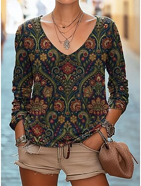 Mujer Blusa Estampado Floral Bohemia Diario Manga Larga Escote en Pico Tops regulares Diario Festivos Negro Blanco Rojo Azul Marino Verde esmeralda Verano Primavera Otoño