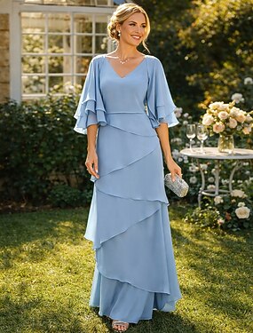Vestido de madre de la novia tipo A invitada de boda elegante dulce cuello en V hasta el suelo chiffon manga larga con volantes fruncidos