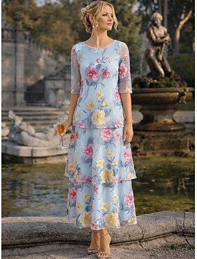 Corte A Vestidos Hasta el Tobillo Vestido de Fiesta Vestido Cóctel Vestido de Madrina Media Manga Camiseta con cuello redondo Elegante Vintage Formal Invitado a la boda Festivos Gasa con Estampado