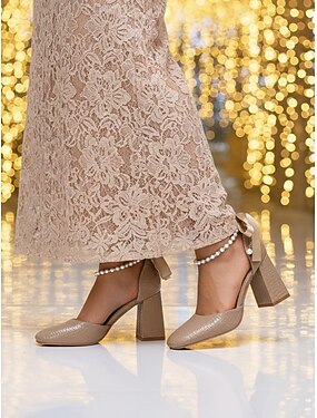 Zapatos de vestir para mujer con tacón cuadrado en color albaricoque y tira de perla en el tobillo: elegantes zapatos texturizados para la madre de la novia en bodas urbanas elegantes.