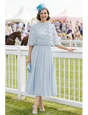 Dos Piezas Corte A Hasta el Tobillo Vestido Midi Vestido Invitada Boda Vestido de Madrina Sin Mangas Manga 3/4 Cuello Barco Elegante Sencillo Minimalista Formal Semi-formal Gasa Encaje con Bordados
