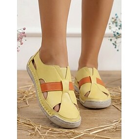 Mocasines sin cordones de piel microbiana amarilla para mujer: zapatos de verano transpirables con correa en contraste para vacaciones, uso diario y comodidad al aire libre.
