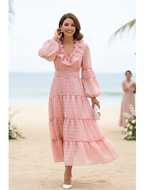 Corte A Hasta el Tobillo Vestido Invitada Boda Vestidos de invitada de boda Elegante Diario Manga Larga Escote en Pico Fiesta de jardin Boda con Volantes