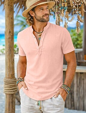 Hombre Camisa Camisa de lino Camisa de manga corta Camisa de verano Ropa de playa Camisa con cuello mao Plano Casual Diario Negro Blanco Amarillo Rosa Manga Corta Escote Chino Verano Ropa