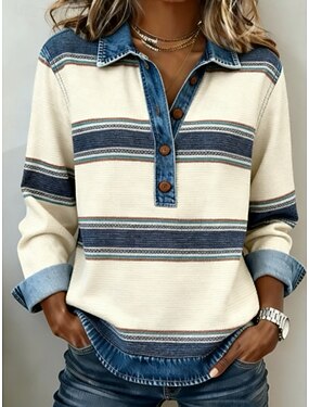 Mujer Camiseta Estampado Graphic Geométrico A Rayas Vintage Elegante Clásico Manga Larga Cuello Barco Escote Redondo Tops regulares Diario Azul Piscina Rosa Verde Trébol Primavera Otoño Invierno