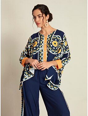 Blusa de mujer azul marino estilo folk magyar, manga larga, escote en V, dobladillo irregular, informal, para uso diario y para todas las estaciones.