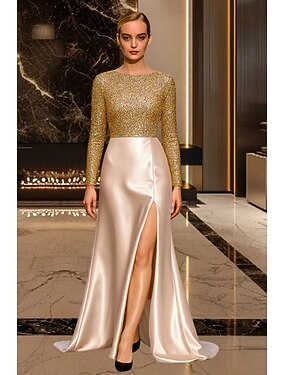 Corte A Cola de Corte Hasta el Suelo Trajes de gala Vestidos de noche Corte Cenicienta Vestimenta formal Elegante Reluciente Estilo de Celebridad Manga Larga Cuello Barco Fiesta de jardin Boda Satén