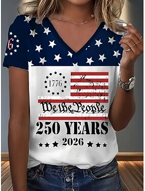 día de la independencia americana Mujer Camiseta Estampado Graphic Bandera estadounidense Vintage Elegante Clásico Manga Corta Escote en Pico Tops regulares Diario Azul Piscina Blanco Charcoat Gris
