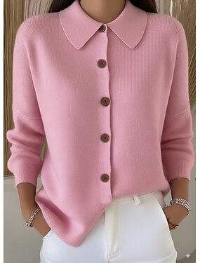 Mujer Chaqueta de Punto Elegante Vacaciones Diario Estriado Cuello Vuelto Cuello Camisero Botones Manga Larga Tops regulares Tejer Trabajo Festivos Rojo tinto Negro Primavera Otoño