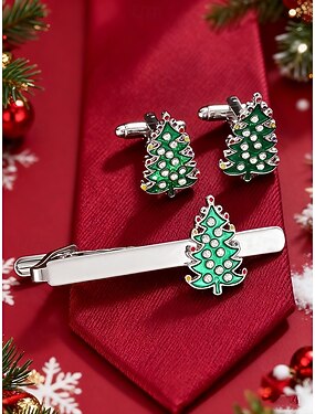 Juego de gemelos y pasador de corbata con diseño de árbol de Navidad para hombre: conjunto de joyas festivas con esmalte verde y detalles de cristal para fiestas navideñas y ocasiones especiales.