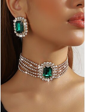 Gargantilla de diamantes de imitación verde esmeralda para mujer &Juego de pendientes, joyería llamativa de cristal en tono dorado, estilo glamoroso para fiesta. &eventos nocturnos