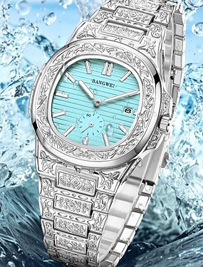 Reloj de pulsera de cuarzo de lujo para hombre, grabado, esfera azul turquesa con fecha, resistente al agua, correa de acero inoxidable tallada, reloj de joyería de moda para hombre, opción de regalo