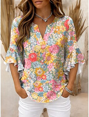 Mujer Blusa Volante Estampado Floral Graphic Vintage Diario Elegante Manga 3/4 Escote en Pico Tops regulares Diario Festivos Ropa de vacaciones Azul Piscina Amarillo Rosa Morado Verano Primavera
