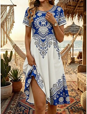 Mujer Vestido hasta la Rodilla Vestido bohemio vestido de playa Vestido de flores Moda Moderno Diario Playa Fin de semana Ajuste regular Geométrico Manga Corta Cuello Barco Azul Piscina Rojo Morado