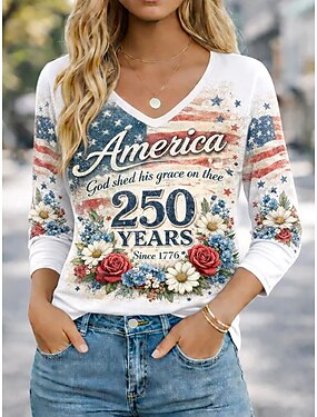 día de la independencia americana Mujer Camiseta Camiseta superior Estampado Graphic Bandera estadounidense Elegante Clásico Casual Manga Larga Escote en Pico Tops regulares Diario Noche Fin de semana