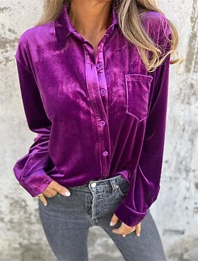 Mujer Camisa Terciopelo Elegant Elegante Bolsillo Botones En Cortina Plano Elegante damas Romántico Manga Larga Cuello Camisero Tops regulares Diario Trabajo Festivos Vino Verde Ejército Morado Marrón