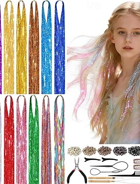 Kit de oropel para el cabello para niñas, 14 colores, 48 pulgadas, kit de oropel para el cabello de hadas, extensiones de cabello con brillo de colores resistentes al calor con herramientas para