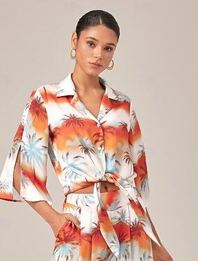 Mujer Camisa con botones Camisa casual Árbol Casual Mangas divididas Naranja Escote en V Anudado Botones Mangas medias Elegante Vacaciones Cuello Camisero Verano