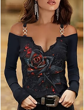 Blusa para mujer gráfica de rosa vintage elegante moderna manga larga cuello en V hombro descubierto tops regulares para impresión diaria salida patchwork negro verano primavera otoño