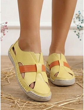 Mocasines sin cordones de piel microbiana amarilla para mujer: zapatos de verano transpirables con correa en contraste para vacaciones, uso diario y comodidad al aire libre.