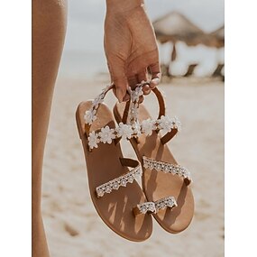 Sandalias blancas con encaje floral para mujer: sandalias bohemias planas con aro en la punta y detalles de perlas para bodas en la playa y vacaciones tropicales. &ropa de verano para resorts