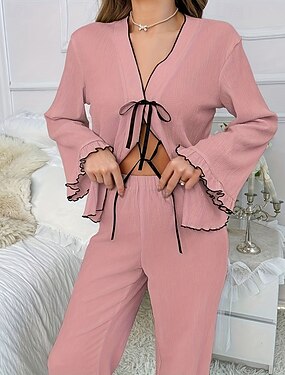 Mujer Ropa de salón Conjunto pijama Moda Casual Color puro Volante Cintura elástica Pantalón Vacaciones Hogar Manga Larga Escote en Pico Rosa Otoño Invierno A Medida