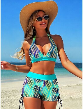 Bikini de mujer de 2 piezas traje de baño de cintura alta sin espalda de moda playera en vacaciones gráfico tropical cuello en V sin mangas
