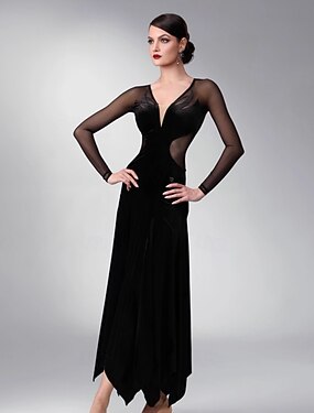 Vestido de baile de salón para mujer, de gasa negra, de malla, manga larga, elegante, para vals, tango, foxtrot, competición