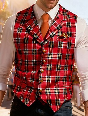 Hombre Chaleco Navidad Exterior Vacaciones Fiesta Moda Ropa de calle Primavera Otoño Botones Polyester Transpirabilidad Plaid Botonadura Simple Escote en Pico A Medida Rojo Claro Rojo Chaleco
