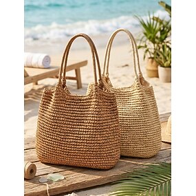 Bolso tote grande tejido para mujer, material de ganchillo, disponible en blanco roto y caqui, diseño espacioso, perfecto para el uso diario informal y las vacaciones en la playa.