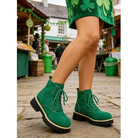 Botines de combate de ante sintético verde para mujer: botas casuales con cordones y suela gruesa, ideales para celebraciones del Día de San Patricio, salidas al mercado, festivales informales y recados diarios.