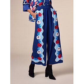 Pantalones casuales de satén holgados con pierna ancha y estampado artístico/retro para vacaciones