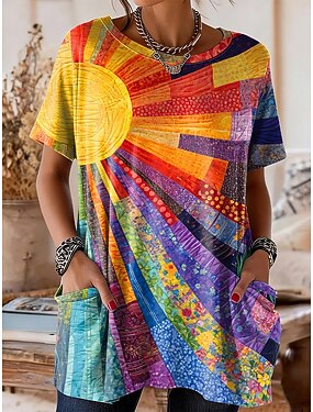 Mujer Camiseta Estampado Graphic Geométrico Vintage Elegante Casual Manga Corta Cuello Barco Tops largos Casual Diario Fin de semana Azul Piscina Morado Naranja Verde Trébol Verano Primavera