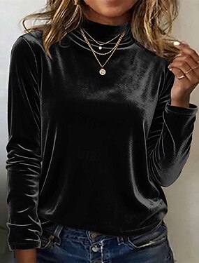 Navidad Mujer Terciopelo Blusa Tops elegantes Frunce Retazos En Cortina Color sólido Plano Elegante Vintage Diario Manga Larga Cuello Alto Tops regulares Diario Trabajo Festivos Negro Vino Marrón