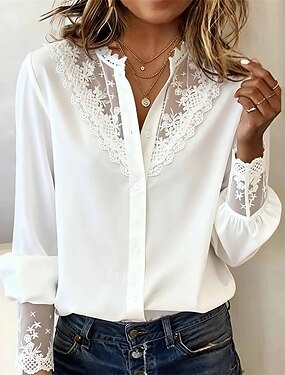 Mujer Camisa de encaje Encaje Color sólido Elegante Moderno Casual Manga Larga Escote en Pico Tops regulares Diario Negro Blanco Caqui Gris Primavera Otoño