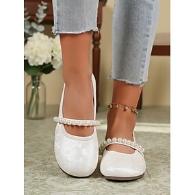Zapatos Mary Jane beige con tiras de perlas sintéticas para mujer: cómodos, de punta redonda y corte ancho, elegante estilo vintage para uso diario, bodas, fiestas de té y viajes.