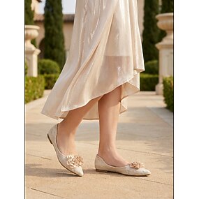 Zapatos planos florales color champán para mujer con acabado texturizado, elegantes zapatos de novia para una boda al aire libre en un jardín.