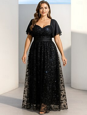 Vestido de fiesta hasta el tobillo estilo A Línea Vestido de cóctel Vestido de invitada de boda Vestido de la madre de la novia Manga corta Cuello en V Vestido negro Talla grande Brilla y resplandece