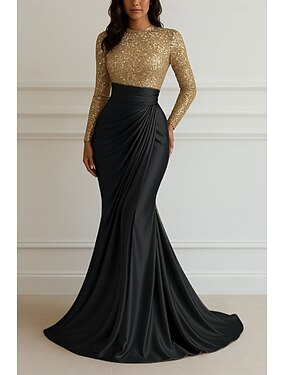 Corte Trompeta Sirena Hasta el Suelo Trajes de gala Vestidos de noche Corte Cenicienta Vestimenta formal Elegante Lentejuelas Manga Larga Cuello Barco Boda Formal Satén elástico con Detalles con