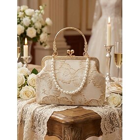 Elegante bolso de mano tipo clutch para mujer con asa de perlas, diseño floral bordado con ribete dorado, disponible en varios colores, ideal para bodas, fiestas y ocasiones formales.