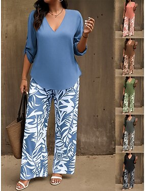 Mujer Conjuntos de pantalones Manga Larga Escote en Pico Hojas Estampado Activo Vacaciones Casual Diario Azul Piscina Negro Rosa Primavera & Otoño Ajuste regular