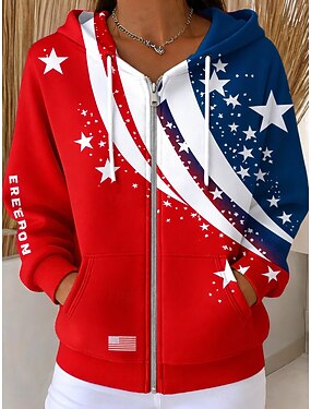 Día de la Independencia Aniversario Americano Patriótico Sudadera de Mujer Sudaderas Geométrica Bloque de Color Casual Manga Larga Cuello Redondo Media Cremallera Ropa Diaria de Calle Patchwork
