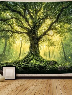 Tapiz de pared con árbol de la vida antiguo y bosque encantado, rayos de sol, árbol musgoso, follaje verde, paisaje natural, decoración para sala de estar, dormitorio, hogar, tapiz mural para colgar