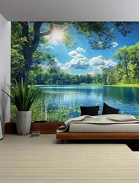 Tapiz de pared realista en 3D con paisaje natural de bosque, lago y luz solar. Árboles verdes, cielo azul, paisaje veraniego. Tapiz colgante para dormitorio, sala de estar, hogar y oficina.