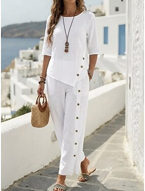 Mujer Conjuntos de dos piezas Conjuntos de pantalones Lino de algodón sintético Media Manga Cuello Barco Plano Moda Ropa de calle Casual Diario Exterior Negro Blanco Verde Trébol Primavera verano