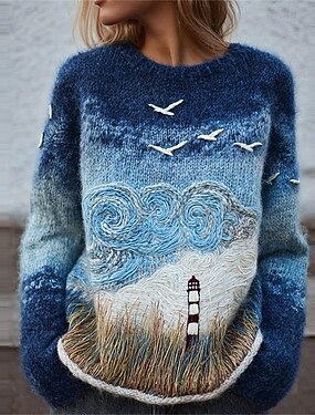 Navidad Suéter de Mujer Pulóver Diario Casual Gráfico Claus Cuello Acanalado Cuello Redondo Tejido Print de Manga Larga Tops Regulares Tejido Exterior Fin de Semana Azul Marino Otoño Invierno