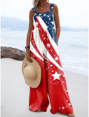 Overoles Patrióticos del Día de la Independencia para Mujeres Gráfico Activo Sin Mangas Pierna Ancha Cuello Cuadrado Botones Diarios de Playa Ajuste Holgado Amarillo Rojo Púrpura Verano